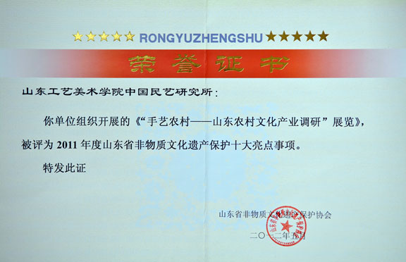 手艺农村展览荣获山东省非遗保护十大亮点事项 2012年6月9日,在山东省暨济南市庆祝第七个文化遗产日活动启动仪式上,永利官网因组织开展“手艺农村——山东农村文化产业调研”展览,荣获2011年度山东省非物质文化遗产保护十大亮点事...